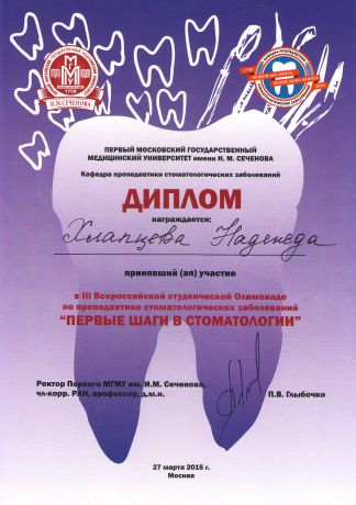 27 марта 2015 года состоялась IIIВсероссийская студенческая олимпиада по пропедевтике стоматологических заболеваний с международным участием «Первые шаги в стоматологии», в которой приняли участие 48 студентов из 33 вузов России, Белоруссии и Китайской народной республики. Олимпиада проводилась на базе первого МГМУ им.И.М.Сеченова.