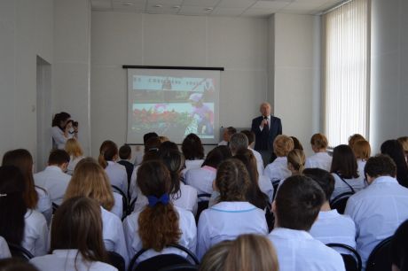 Мероприятие открыл проректор по научной, инновационной и воспитательной работе РязГМУ, профессор В.А. Кирюшин. Он отметил значимость мероприятия, посвященного Дню победы. «Сегодня мы часто сталкиваемся с тем, что вклад Советской армии в победу над фашизмом обесценивается. Нам нужно не только оберегать память о Великой Отечественной войне, но и передать ее нашим потомкам, - обратился к участникам встречи В.А.Кирюшин. Далее с приветственной речью выступил заведующий кафедрой госпитальной терапии, профессор С.С. Якушин. В своем выступлении он напомнил об основных исторических вехах Великой Отечественной войны, отметив, что многие сегодня забывают, насколько обширным был театр военных действий Второй мировой войны, а также не осознают значимость событий, последовавших после 22 июня 1941 года.