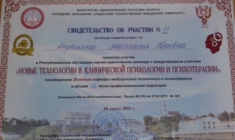 Научно-практический республиканский семинар с международным участием «Новые технологии в клинической психологии и психотерапии» состоялся в республике Беларусь. Мероприятие проходило в Гродненском государственном медицинском университете и было посвящено 20-летию кафедры медицинской психологии и психотерапии.
