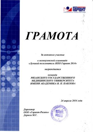 Студенты фармацевтического факультета, активисты студенческого научного кружка кафедры управления и экономики фармации приняли участие в межвузовской областной олимпиаде для студентов высших учебных заведений «Лучший пользователь ИПО Гарант-2015», которая проводилась компанией "Гарант-Рязань".