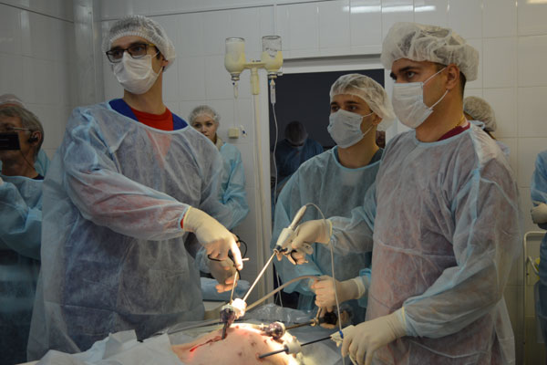 Мастер-класс по отработке базовых и углубленных хирургических навыков для наших студентов прошел под руководством сотрудников кафедры хирургии, акушерства и гинекологии ФДПО РязГМУ: заведующего кафедрой Д.А Хубезова, ассистентов Д.К. Пучкова и М. А.Евсюковой, аспиранта С. В. Родимова. Совместно с врачами отделения колопроктологии Областной клинической больницы они выполнили ряд хирургических операций: аппендэктомия, холицистэктомия, резекция участка тонкой кишки с формированием межкишечного анастомоза, удаление желчного пузыря и маточных труб.