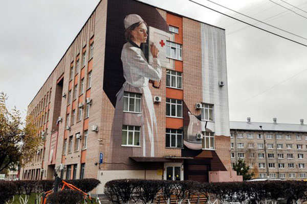 Изображение фронтовой медсестры сделал Александр Дёмкин. По его словам, паблик-арт - это уличное изобразительное искусство в его легальном воплощении, больше похожее на диалог со зрителем. Сегодня у молодого художника немало произведений в жанре сюрреализма, его стиль узнаваем. Он работает в основном с образами в контексте города.