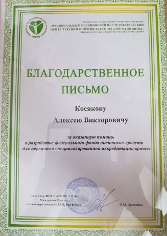 Преподаватель кафедры госпитальной терапии с курсом медико-социальной экспертизы Алексей Викторович Косяков принимал активное участие в разработке федерального фонда оценочных средств для первичной специализированной аккредитации врачей.