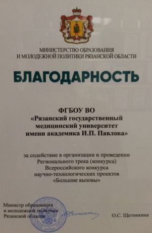 За помощь в проведении регионального трека Всероссийского конкурса университет удостоен благодарности Министра образования и молодёжной политики Рязанской области О.С. Щетинкиной.