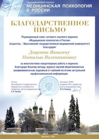Благодарность декану факультета клинической психологии, заведующей кафедрой общей и специальной психологии с курсом педагогики доценту Наталье Валентиновне Яковлевой вручена за многолетнюю и плодотворную работу в журнале "Медицинская психология в России".