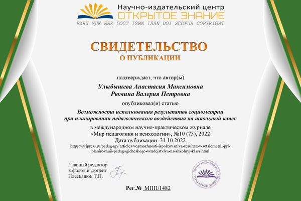 Исследование выполнено под руководством заведующей кафедрой общей и специальной психологии с курсом педагогики, доцентом Н.В. Яковлевой. Результаты исследования прошли апробацию на студенческих научных конференциях. Статья прошла строгое научное рецензирование в журнале «Мир педагогики и психологии» и опубликована в октябрьском номере журнала.