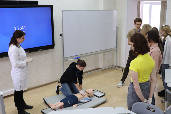 На двух других занятиях кандидат медицинских наук Илья Вячеславович Бахарев, старший преподаватель центра и ассистент центра Дарья Романовна Жданкина научили старшеклассников базовой сердечно-легочной реанимации, пройдя всю последовательность действий в теории, и закрепили на практике. Школьники также смогли отработать полученные навыки на манекене.