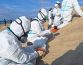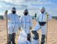 Делегация ищет химический мусор на Бугазской косе. Ребята выходят работать утром, сразу после завтрака, с помощью лопат и сит собирают мазут. За день команда наполняет и оттаскивает к точке сбора десятки мешков с загрязнённым грунтом.
