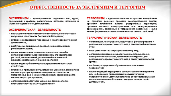 Правовые и организационные основы противодействия экстремистской деятельности, ответственность за осуществление экстремистской деятельности определены Федеральным законом Российской Федерации «О противодействии экстремистской деятельности» №114-ФЗ от 25.07.2002г.