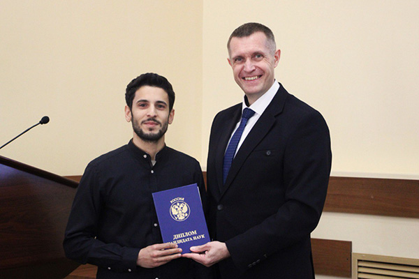 Lors de la récente réunion du Conseil académique, Glenza Ayoub et Msakni Moez ont reçu officiellement leur diplôme de candidat ès sciences des mains du recteur de l'université, le professeur Roman Evgenievich Kalinin.