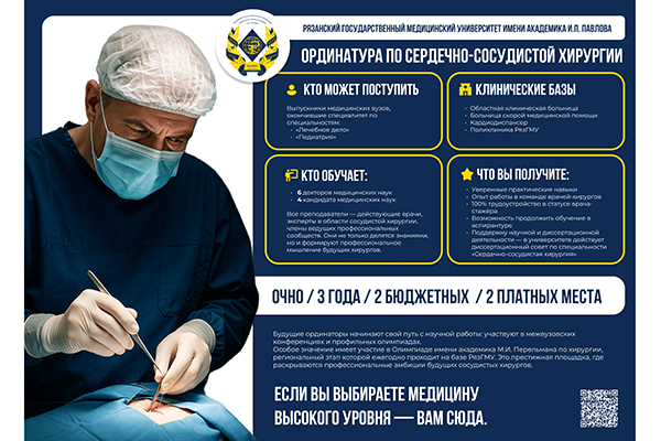 Ординатура в РязГМУ —это не просто продолжение образования. Это ваш профессиональный старт в сильной команде и в одном из лучших хирургических треков региона. Если вы выбираете медицину высокого уровня — вам сюда.