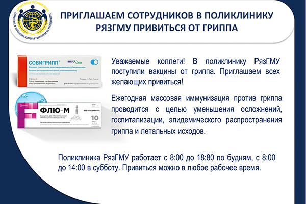 Уважаемые коллеги! В поликлинику РязГМУ поступили вакцины от гриппа Совигрипп и Флю-М. Приглашаем всех желающих привиться!