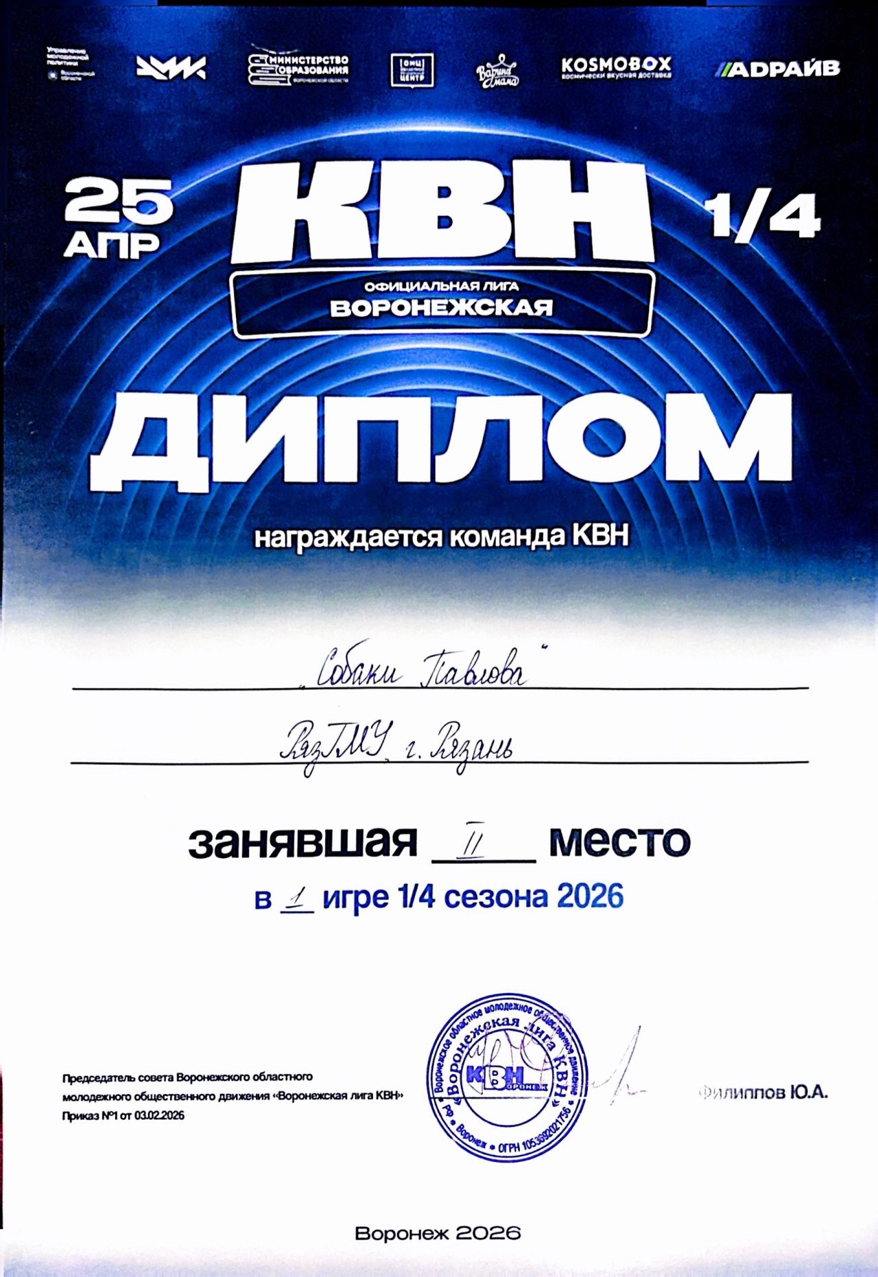 25 апреля состоялся четвертьфинал Воронежской официальной лиги КВН, в котором сразились 11 команд. Соревновательная программа включала три конкурса: «Приветствие», «Пуш-уведомление» и «Сложную ситуацию».