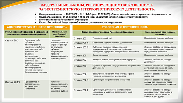 Правовые и организационные основы противодействия экстремистской деятельности, ответственность за осуществление экстремистской деятельности определены Федеральным законом Российской Федерации «О противодействии экстремистской деятельности» №114-ФЗ от 25.07.2002г.