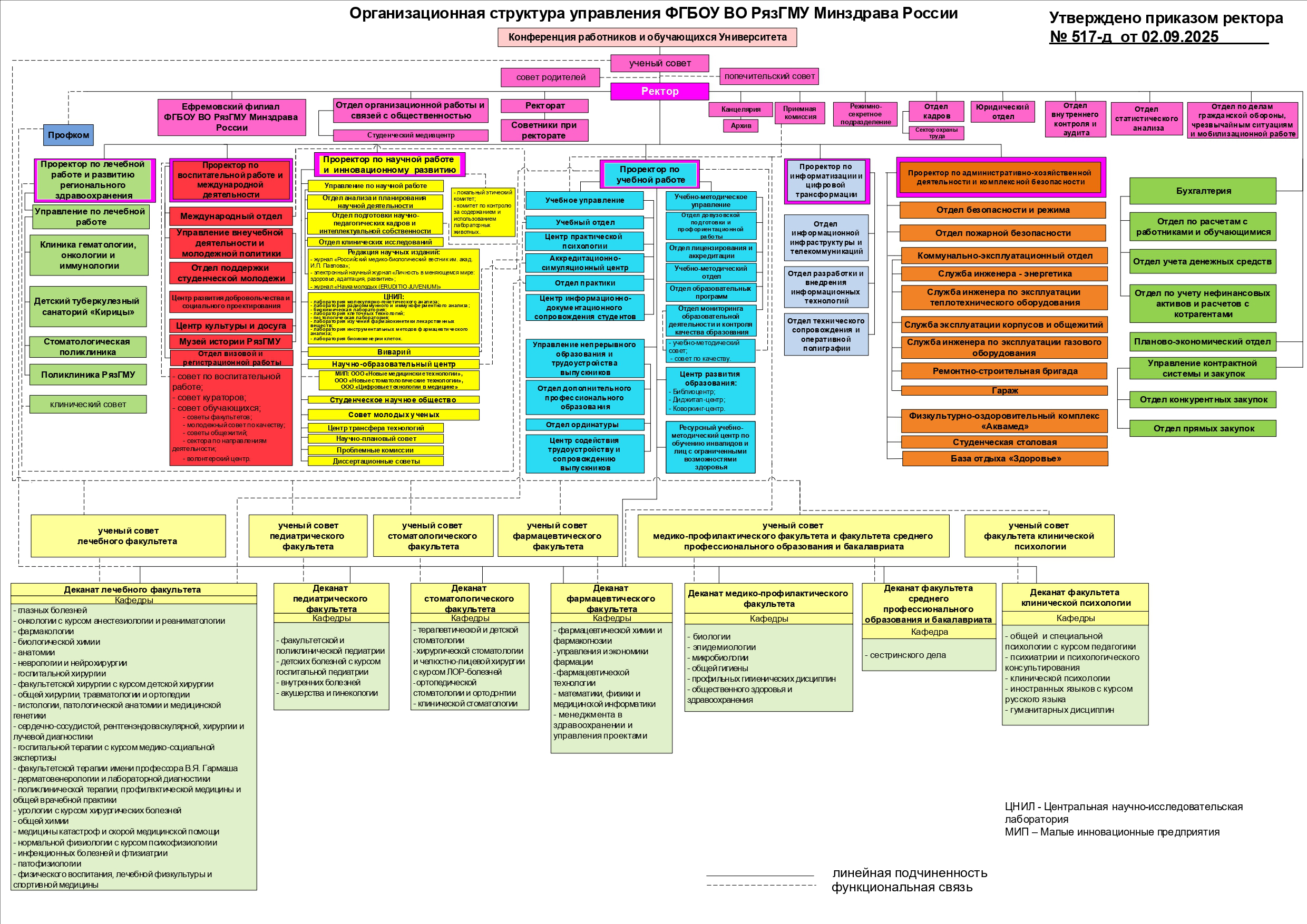 Организационная структура управления ФГБОУ ВО РязГМУ Минздрава России утверждена приказом ректора университета №517-д от 02.09.2025 г.