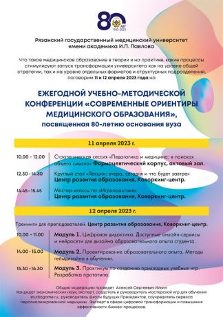 Что такое медицинское образование в теории и на практике, какие процессы стимулируют запуск трансформации университета как на уровне общей стратегии, так и на уровне отдельных форматов и структурных подразделений, поговорим 11 и 12 апреля 2023 года на ЕЖЕГОДНОЙ УЧЕБНО-МЕТОДИЧЕСКОЙ КОНФЕРЕНЦИИ «СОВРЕМЕННЫЕ ОРИЕНТИРЫ МЕДИЦИНСКОГО ОБРАЗОВАНИЯ», посвященной 80- летию основания вуза.