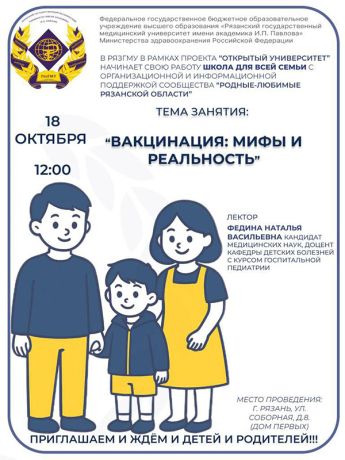 Данный обучающий цикл создан в рамках проекта "Открытый университет для взрослого населения», при организационной и информационной поддержке сообщества "Родные-любимые Рязанской области» Российского движения детей и молодежи «Движение первых». Организатор нового обучающего цикла  для населения - кафедра детских болезней с курсом госпитальной педиатрии. Следующее занятие состоится в субботу, 18 октября, по адресу: г. Рязань, Ул Соборная, д. 8.