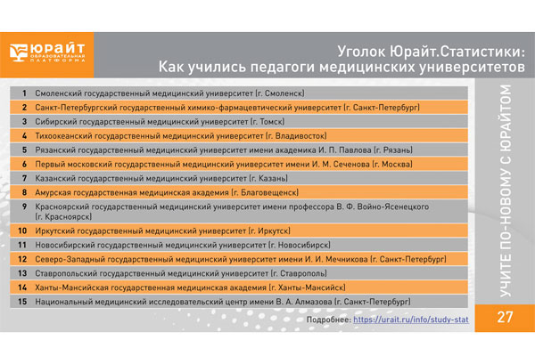 The ranking is compiled on the basis of digital traces of students’ and teachers’ various activities on the educational platform "Urait" and shows how often a university has used the platform to arrange its curricular activity from the beginning of 2019-2020 academic year. To that end, "Urait Statistics" team analyzed the educational behavior of 129 666 students and 17 923 teachers of 836 Russian-speaking higher education organizations located in Russia and the CIS.