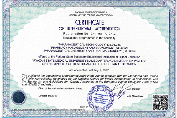 Recently the National Centre for Public Accreditation has certified that RSMU educational programs in the listed below fields meet the criteria of the European Standards for Quality Assurance of Education (ESG) and the International Standards of the World Federation of Medical Education (WFME):