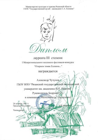 РязГМУ представляли Бадис Деббеш, студент 4 курса стоматологического факультета, и Александр Чучунов, студент 3 курса лечебного факультета, под руководством директора Центра культуры и досуга Светланы Алексеевны Бодровой. Исполненные ими произведения были отобраны представителями оргкомитета фестиваля на Литературном вечере ко дню рождения Есенина, недавно прошедшем в РязГМУ.
