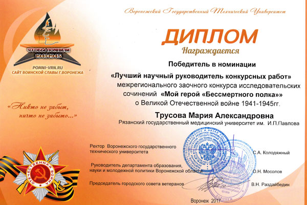 - Номинация «Лучшая литературная запись воспоминаний» - Зинаида Газарян (студентка 1 курса, лечебного факультета);