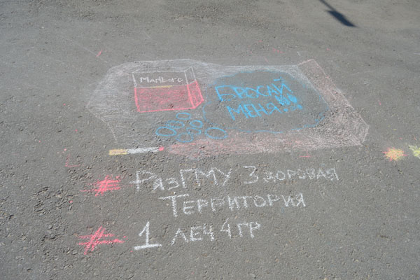 В рамках акции на территории медгородка, а также на центральной улице Рязани прошло сразу несколько интерактивных площадок, первой из которых стал конкурс рисунков на асфальте под девизом «Бросьте курить немедленно!». Несколько групп студентов собрались вечером 30 мая и нанесли на асфальтную дорожку у бассейна «Аквамед» уличные меловые плакаты с призывами отказаться от никотина.