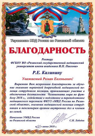 На имя ректора РязГМУ, профессора Романа Евгеньевича Калинина поступила благодарность от начальника УМВД России по Рязанской области полковника юстиции Сергея Николаевича Лебедева за обучение оказанию первичной доврачебной медицинской помощи сотрудников полиции, принимающих участие в обеспечении безопасности Чемпионата мира по футболу 2018; содействие в подготовке и переподготовке медицинского персонала ФКУЗ МВД России по Рязанской области, а также в оказании медицинской помощи сотрудникам и пенсионерам органов внутренних дел и членам их семей.