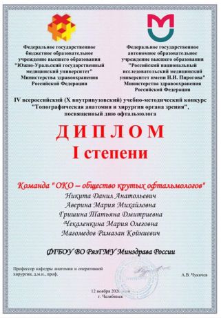 11-12 ноября в онлайн-формате проходила I международная научно-практическая конференция «Топографическая анатомия и хирургия органа зрения». В рамках конференции также проводился IV Всероссийский учебно-методический конкурс, победителями которого и стали студенты РязГМУ Д.А. Никита, М.М. Аверина, Т.Д. Гришина, М.О. Чекаленкина и Р.К. Магомедов!