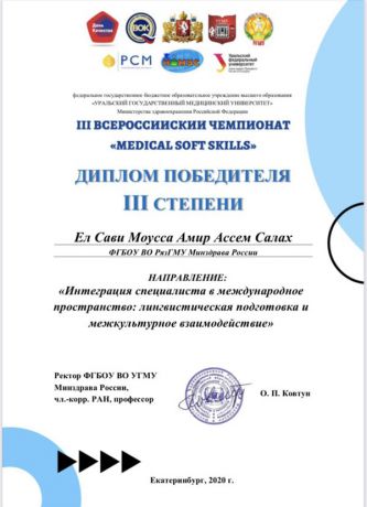 В этом году на Всероссийском Чемпионате «Medical Soft Skills» наш университет представили Анна Петрова и Амир Ел Сави, обучающиеся по программе «Переводчик в сфере профессиональной коммуникации». Старший преподаватель кафедры иностранных языков с курсом русского языка Ирина Валентиновна Гарески выступила в качестве эксперта на площадке «Интеграция специалиста в международное пространство: лингвистическая подготовка и межкультурное взаимодействие».