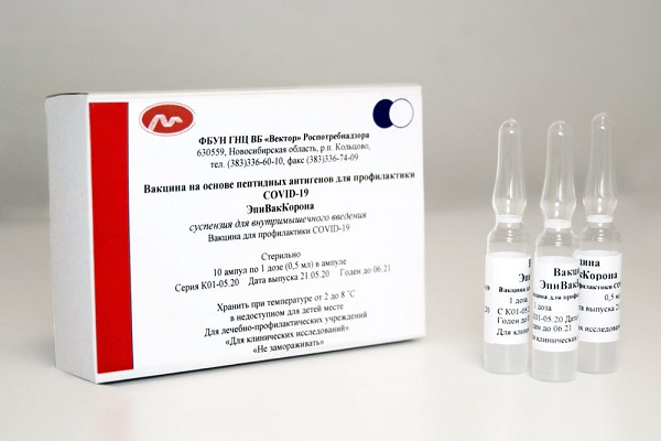 "ЭпиВакКорона". "ЭпиВакКорона" стала второй, зарегистрированной в России. Это генно-инженерная пептидная вакцина - на основе искусственных пептидов, копирующих фрагменты коронавируса. Вводится двукратно внутримышечно с интервалом в 2-3 недели. Иммунологическая эффективность 100%. Иммунная защита, ожидается, будет действовать не менее года. Сильных нежелательных явлений не выявлено, у немногих отмечена боль в месте укола и повышение температуры до 38,5.