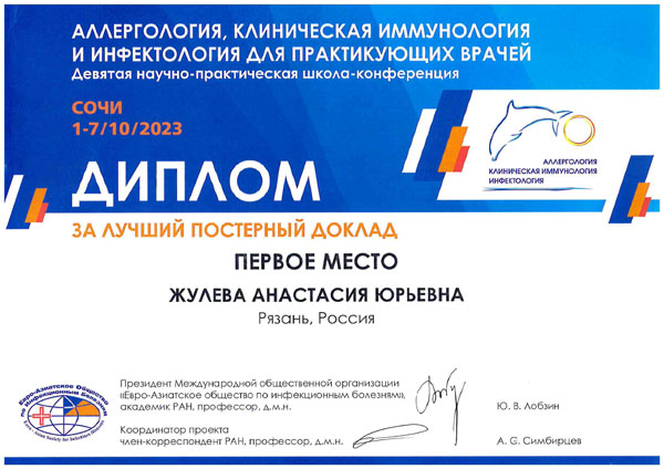 I место занял постерный доклад «Клинико-эпидемиологическая характеристика менингококковой инфекции у детей Рязанской области», Анастасии Жулевой, подготовленный под руководством ассистента кафедры факультетской и поликлинической педиатрии с курсом ФДПО Владимира Горячева на IX научно-практической школе в Сочи.