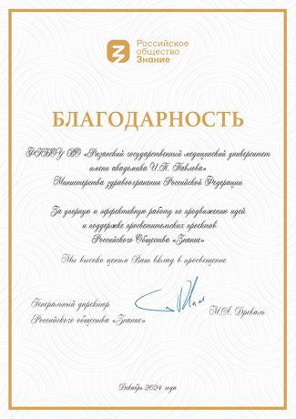 Российское общество «Знание» отметило благодарностью Рязанский медицинский университет им. академика И.П. Павлова за упорную и эффективную работу по продвижению идей и поддержке просветительских проектов.
