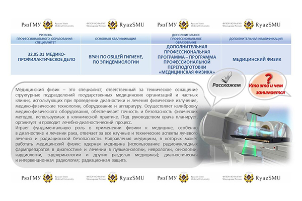 На базе этого факультета реализуется дополнительная программа профессиональной переподготовки «Медицинская физика» - направление — отражение современных вызовов в здравоохранении.