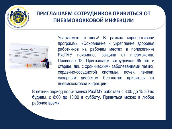 в поликлинике РязГМУ доступна вакцинация от пневмококковой инфекции препаратом «Превенар 13».