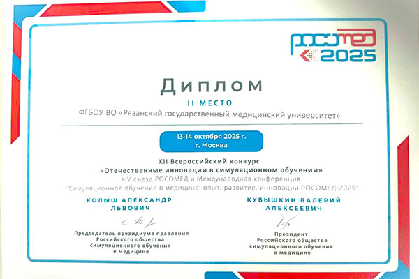 Диплом II степени был вручен председателем президиума правления Российского общества симуляционного обучения в медицине Александром Львовичем Колином и президентом общества Валерием Алексеевичем Кувышкиным.