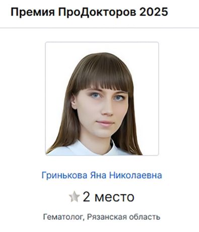 В 2025 году в номинации «Лучшие врачи Рязанской области» почётное 2-ое место заняла врач-гематолог Клиники ГОИ РязГМУ Гринькова Яна Николаевна.
