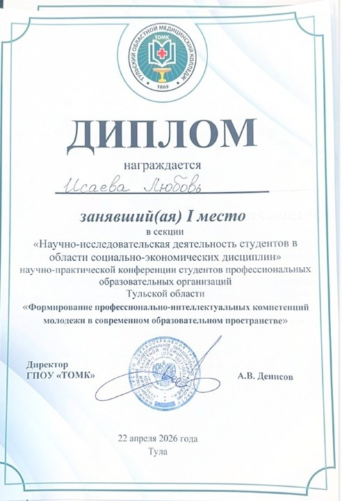 22 апреля 2026 года на базе ГПОУ «Тульский областной медицинский колледж» прошла очная научно-практическая конференция студентов профессиональных образовательных организаций «Формирование профессионально-интеллектуальных компетенций молодежи в современном образовательном пространстве».